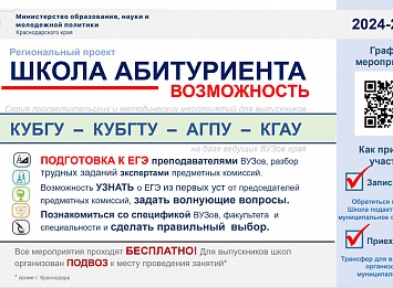 В Краснодарском крае реализуется региональный проект «Школа абитуриента». Для выпускников 11-х классов организована серия очных мероприятий для подготовки к ЕГЭ на базе ведущих ВУЗов края. У школьников есть возможность встретиться с председателями и экспертами предметных комиссий, задать волнующие вопросы, разобрать трудные задания КИМ с преподавателями ВУЗов. Знакомство со спецификой ВУЗов, факультетов, специальностей поможет сделать выпускникам правильный выбор. Для школьников отдалённых районов организован подвоз. Все мероприятия проходят бесплатно.