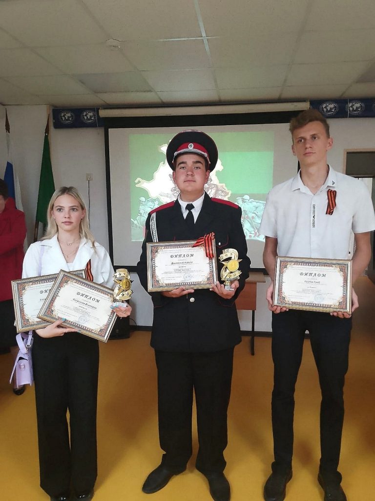 Дипломом I степени в номинации «Литературно-краеведческие произведения (рассказ)» награжден Дашевский Кирилл, обучающийся в МКОУ ООШ №39; диплом III степени в номинации «Авторские поэтические произведения» получила Бисаинова Виктория, обучающаяся МБОУ СОШ №1, Виктория также заняла первое место в викторине, посвященной Великой Отечественной войне, также диплом III степени, но в номинации «Презентация» получил Козлов Глеб, обучающийся МАОУ СОШ №4. Поздравляем победителя и призеров!