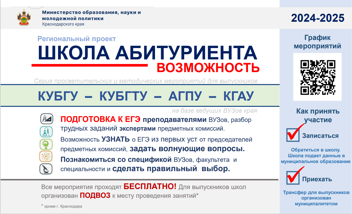 В Краснодарском крае реализуется региональный проект «Школа абитуриента». Для выпускников 11-х классов организована серия очных мероприятий для подготовки к ЕГЭ на базе ведущих ВУЗов края. У школьников есть возможность встретиться с председателями и экспертами предметных комиссий, задать волнующие вопросы, разобрать трудные задания КИМ с преподавателями ВУЗов. Знакомство со спецификой ВУЗов, факультетов, специальностей поможет сделать выпускникам правильный выбор. Для школьников отдалённых районов организован подвоз. Все мероприятия проходят бесплатно.