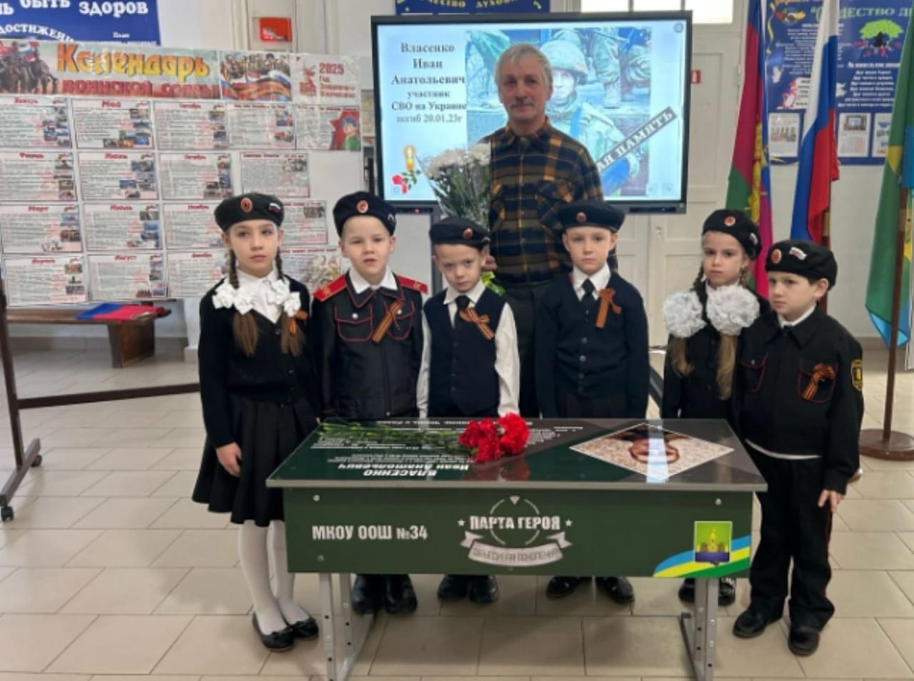 21 февраля в стенах школы МКОУ ООШ N34 х. Ленинского состоялась торжественная линейка, приуроченная к открытию парты в честь Героя Власенко Ивана Анатольевича.