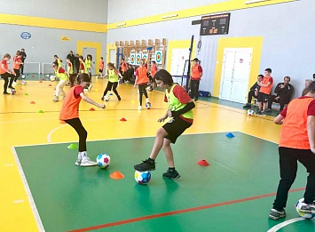 Далее методист провёл три коротких мастер-класса с учащимися школы, в ходе которых были реализованы уроки футбола с различными формами организации. Были продемонстрированы занятия по «ширине зала», «круг» и «крест».