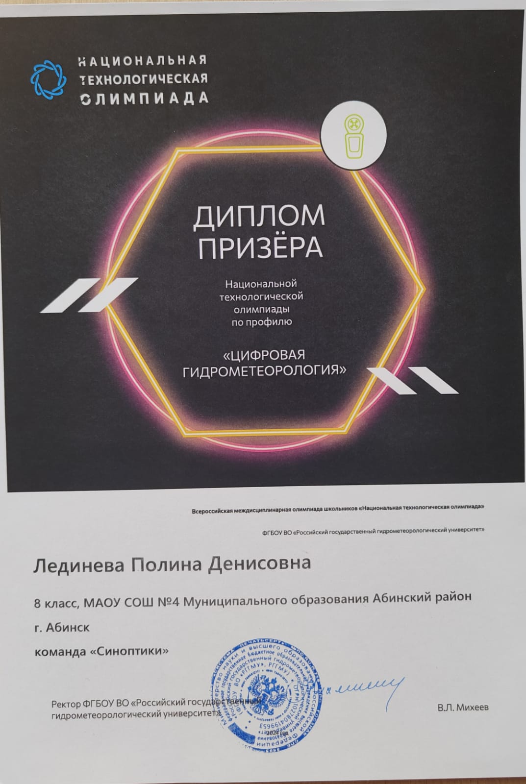 С 19 по 24 февраля 2024 года в очном заключительном этапе (финале) Всероссийской междисциплинарной олимпиады школьников «Национальная технологическая олимпиада» в г.Санкт-Петербург приняла участие ученица 8 класса СОШ №4 г.Абинска Лединева Полина. Она стала призёром олимпиады и получила диплом призёра, подписанный ректором ФГБОУ ВО «Российский государственный гидрометеорологический университет».